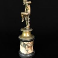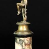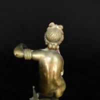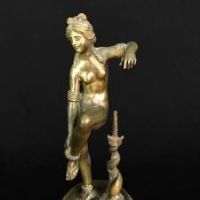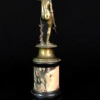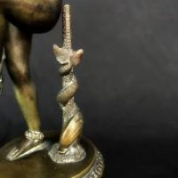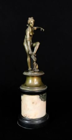 Das Glück, das diese Art der Darstellung in den folgenden Jahrhunderten hatte, wird durch die große Anzahl von Skulpturen bewiesen, die sie darstellen. In diesem Bronzewerk greift die Göttin die Position der Nackten Venus von Oplontis wieder auf: Hier hält Venus einen Apfel in ihrer linken Hand, eine Erinnerung an ihren Sieg im Schönheitswettbewerb, bei dem sie nach dem Urteil des Paris über Minerva und Juno triumphierte. In unserer Bronze scheint die Hand den Apfel jedoch festhalten zu wollen, der aber nicht modelliert wurde. Vielleicht ist die Bronze von einem anderen Werk inspiriert, wie die Bronzen im archäologischen Museum von Padua. Ein weiteres Beispiel ist die berühmte "Venus im Bikini", die in Pompeji gefunden wurde und ??? definiert wurde, weil sie die Göttin in der gleichen Pose zeigt, aber mit der Brust und den Hüften, die mit Gold gemalten Bändern bedeckt sind. Der abgebildete Delfin könnte stattdessen von der Venus Medici inspiriert sein, während die beschriebene Frisur eher der der kapitolinischen Venus entspricht: eine komplexe Frisur mit einem hohen Knotenbogen und Locken, die auf die Schultern fallen.