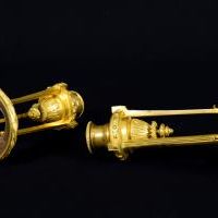 The tripod-shaped objects have a circular base decorated with a band of laurel leaves. The feet are inserted on the base with decorative elements with a foliage motif. The body, suspended on the tripod and decorated with palmette motifs and foliage elements, is supported by a band adorned with geometric patterns.