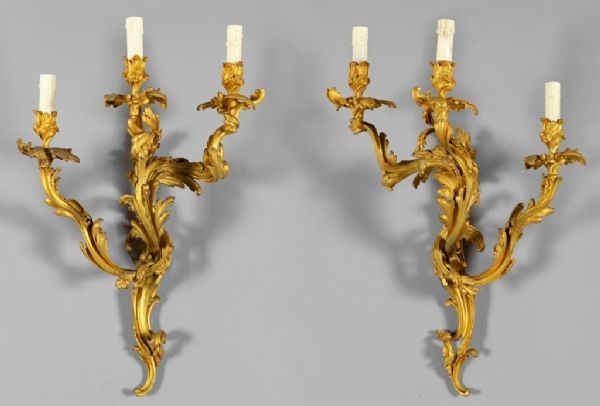 Importante coppia di appliques da parete in bronzo dorato a tre luci finemente cesellate con ricca decorazione rocaille a motivo fogliato. Stile Luigi XV, fine XIX secolo. Recano sigla sul retro.