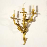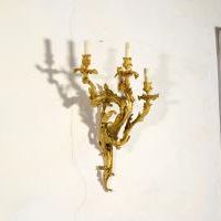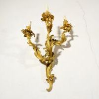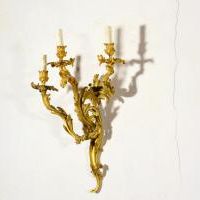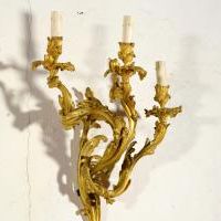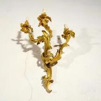 Coppia di appliques francesi in bronzo dorato a tre luci, stile Luigi XV, XIX secolo