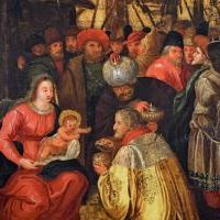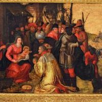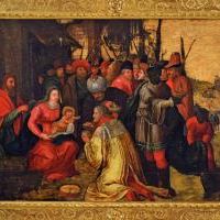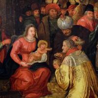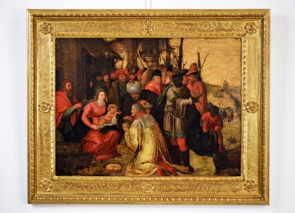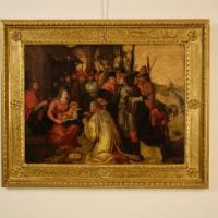 The depiction proposes a traditional iconography, in which the painter inserts some details that lend themselves to symbolic interpretations. Among these is the appearance of the Magi, which since the 14th century has differed iconographically: the wise astronomers represent the homage to Jesus from the parts of the world then known, namely Africa, Asia and Europe. To the right of the Magi, in the foreground, sits a monkey, considered a demonic creature and a symbol of falsehood and sin. It is depicted apart, as defeated, next to a fragment of a classical column: the ruin alludes to the end of paganism, the old world that collapses at the advent of the new one, marked by the birth of Christ and liberation from Original Sin. Ivy climbs on the ruins, a symbol of the immortality of the soul. The work is attributable to the workshop of the Flemish painter Frans Francken III, belonging to a prolific family of Antwerp painters who played a prominent role in local art for four generations. Probating is the comparison with a painting by Frans Francken III, kept at the Museum of Fine Arts in Tournai, Belgium. In this work, the same composition is represented, with some chromatic variations and in which the artist describes, in the background, a glimpse of a Flemish city with houses, a bridge under which a river flows and some inhabitants. The blue sky is marked by some clouds and some bare trees suggest the winter season.