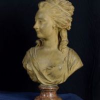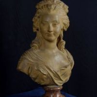 The refined bust, made of terracotta, depicts a noblewoman dressed according to the fashion of the mid-18th century in France. The graceful young woman has her hair styled according to the taste that spread at the court of King Louis XV. She wears a simple dress that drapes across the neckline. The bust bears the signature of Augustin Pajou Paris and is dated 1765. The sculpture rests on a marble base with a circular section.
