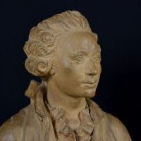 The refined bust depicts a nobleman dressed according to mid-18th century fashion in France. The man wears his hair tied in a ponytail secured with a ribbon. He wears an open jacket that showcases his elaborate Rococo-style shirt. The bust bears the signature of Augustin Pajou Paris and is dated 1725.The sculpture rests on a marble base with a circular section.