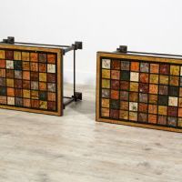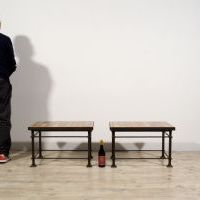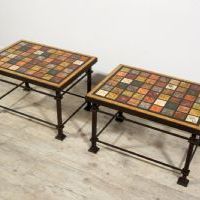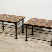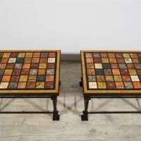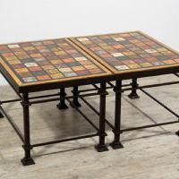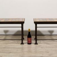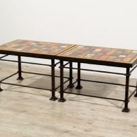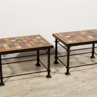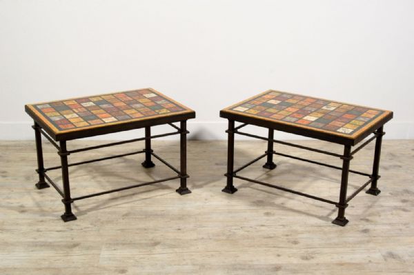La coppia di tavolini è stata realizzata intorno agli anni Cinquanta del Novecento. La struttura è in ferro battuto con le quattro gambe raccordate in alto e in basso da traverse e snodi quadrandolari che riprendono il disegno dei piedi. Il piano, di forma rettangolare è in legno laccato a finto marmo. La decorazione simula un piano in commessi dei più pregiati marmi e pietre dure a campionatura, ovvero differenti di colorazione, in uno stile caratteristico della zona romana.