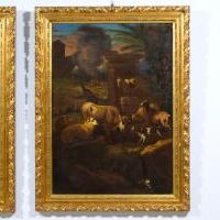 In both compositions, the groups of farm animals are represented in the foreground, in an outdoor environment, with rocks, small shrubs and roots, some tall trees and palm trees, and some architectural ruins. In the background, the activity of villages is described with vivacity and a swarm of small figures engaged in daily tasks. In one canvas, the lighting of a fire, in the other the storm with lightning that marks the horizon, are the pretext for depicting large gray clouds that create a strong contrast with the intense blue of the sky. The light that is created, strongly theatrical and twilight, envelops the atmosphere with shadows. Only a few luminous rays highlight some animals, whose golden fleece emerges from the brown colors that characterize the whole.