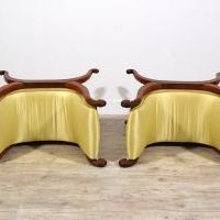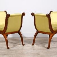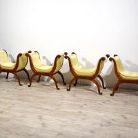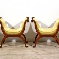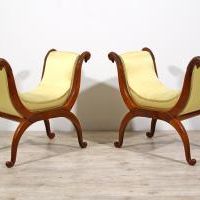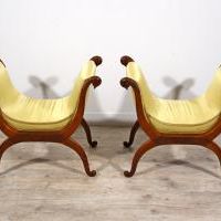 I quattro eleganti sgabelli sono stati realizzati in legno pregiato, nelle prime decadi del XIX secolo in Toscana. La particolare forma della seduta a X, detta a curule, deriva da una sedia pieghevole in uso presso l’antica Roma. La seduta curvilinea, rivestita da cuscini foderati, accoglie comodamente. Molto confortevoli inoltre sono i poggia braccia, che, aggettanti all’infuori, terminano con decoro a ricciolo ornato da elementi fitomorfi. Le quattro gambe convesse e curvilinee, anch’esse terminanti a ricciolo, risultano molto stabili. La linea leggiadra e decorativa rende questi quattro sgabelli, utilizzabili come poltroncine, molto versatili e collocabili, anche al centro degli ambienti, in diversi luoghi, quali salotti e studi o ingressi e corridoi, nonché sale da letto e da bagno. Possono essere esposti in coppia, tutti e quattro, o singolarmente, sia accostati ad arredi antichi che moderni.