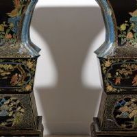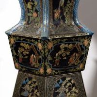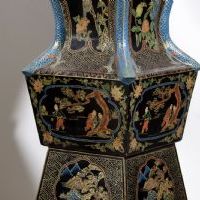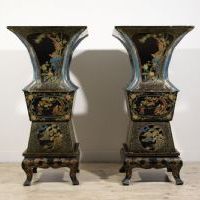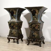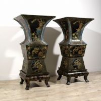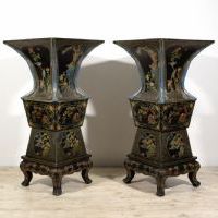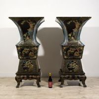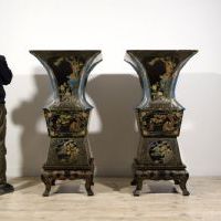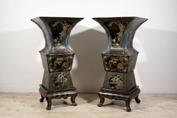 This pair of monumentally sized vases was made in Europe towards the end of the 19th century in an oriental style. Made of wood entirely lacquered in black, the vases are finely decorated with paintings, in polychrome and golden lacquer, reminiscent of the cloisonné technique. They are divided into two separable parts: square bases, with mixtilinear profiles and moving and arched legs, on which the vases rest. These are made up of three inseparable portions. The lower one, in the shape of a truncated pyramid, has smooth sides that tend to widen downwards, the reverse median and the upper one, with a square section, follows a trumpet pattern that narrows in the center and widens again towards the top. Each side of each portion, including the bases, is decorated with oriental motifs: geometric and phytomorphic decorations, landscapes and characters, birds, are inspired by the characteristic production of Japan and China, very popular in Europe, already starting from the 18th century.