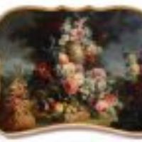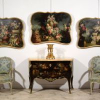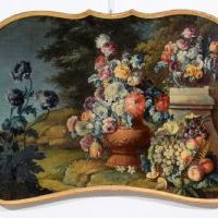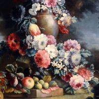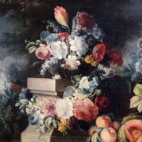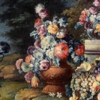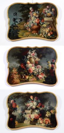 The three paintings, made in oil on canvas and presented in gilded wooden frames in style, depict still lifes with triumphs of flowers and fruit. The works are attributed to the excellent 18th-century Piedmontese still life painter Michele Antonio Rapous (Turin, 1733 – 1819). The compositions are described in open spaces with tall trees that, in the background, create a backdrop and a dark background on which the vibrant colors of the flowers stand out. The floral arrangements are placed in large Baroque vases, on architectural elements and laid on the ground. The fruit, melons, grapes, peaches, plums, mushrooms, are arranged as if casually on the ground or overturned in a wicker basket. In the foreground, flowering plants in backlight help to create depth to the scene. The canvases are a characteristic example of Rapous' artistic production, well representative of his ability in compositional rendering, material and in the skillful use of a lively, saturated and balanced palette.