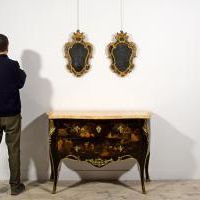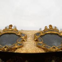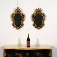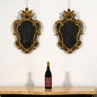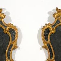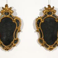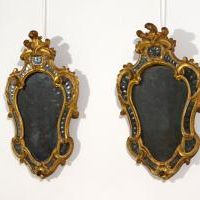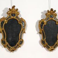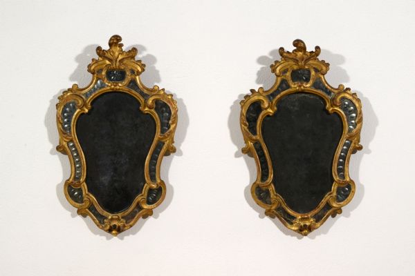 La pregevole coppia di piccole specchiere, realizzata intorno alla metà del Settecento in Piemonte, presenta una cornice lignea dorata e intagliata a motivi fogliati con inserimenti di porzioni di specchio molato di ispirazione veneziana. Le cimase sono speculari con forma a ventaglio fogliato e specchi molati. Sul corpo centrale è applicato uno specchio al mercurio, coevo e originale che mostra il corretto annerimento della superficie dovuto all’alterazione e ossidazione propria del mercurio.