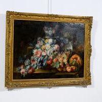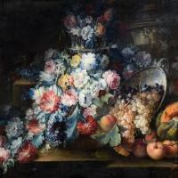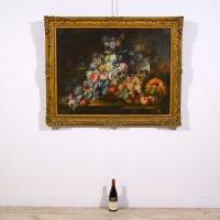 This valuable painting, presented within an 18th-century style carved and gilded frame, depicts a composition of flowers and fruit set in a garden. On some stone steps are depicted silver vases and cups filled with fresh and soft flowers and fruit, including white and black grapes, peaches, and an open melon in the foreground on the right. In the background, an urn vase is decorated with bas-reliefs with scenes of classical taste. The pyramidal composition of the still life, rendered masterfully in the chromatic choice, saturated and brilliant, emerges from a dark background in which some vine leaves can be seen. The work is attributed to the illustrious Piedmontese still life painter Michele Antonio Rapos (or Rapous as it is more traditionally written), certainly the best still life author in Piedmont between the late eighteenth and early nineteenth centuries. Highly appreciated by the Savoy court and the local nobility, the artist is present in the main court residences and in numerous private palaces and castles throughout Piedmont. Michele Antonio Rapos was born in Turin in 1733 and died there in 1819. Brother of Vittorio Amedeo, also an important court painter, he specialized in the genre of still life, enjoying success at the Savoy court, from which he received commissions for the Reggia di Venaria Reale, Stupinigi, and the Royal Palace of Turin. Rapos's still lifes possess particular characteristics that make them easily identifiable, including the type of flowers depicted, the meticulous rendering of details, the present vases, and the theatricality of the presentation. The painter interprets the Piedmontese Rococo taste with grace and decorative lightness, demonstrating knowledge of the French still life painters of the eighteenth century.