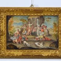 Finally, the last painting depicts the famous biblical episode in which Moses brings forth water from the rock to quench the thirst of the people of Israel during the Exodus in the desert. In the center of the composition, Moses, wrapped in a light cloak, strikes the rock with the staff, while around him men, women and children hurry with containers, kneeling or reaching out to collect the miraculous water. The setting is natural and luminous, with trees and mountains in the background and animal details in the foreground such as the dog and the bird near the stream. The scene refers to the book of Numbers (20:1-11) and Exodus (17:1-7), where Moses, behind divine command, beats the rock in the desert of Meriba to offer water to the people afflicted by thirst. The event is a symbol of trust in God and his providence: the miracle reveals the role of Moses as guide and mediator between God and the Israelites in difficulty.