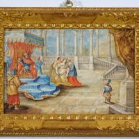 The third painting depicts Queen Esther at the culminating moment of her meeting with King Ahasuerus. The scene takes place in a sumptuous court environment, characterized by a colonnade, a monumental staircase and rich draperies. Ahasuerus, sitting on the throne under a red and blue canopy with lambrequins, extends his arm towards Esther, who faints from the tension while two handmaids support her. In the background, court figures and architectural details complete the regal atmosphere, while the vivid colors and minute details enhance the theatricality of the moment. The scene refers to a passage from the Book of Esther. The young queen, risking her life, appears before the king without being summoned, to intercede on behalf of her threatened people. Due to strong agitation Esther faints, and Ahasuerus, moved to compassion, welcomes her and extends the scepter towards her, a gesture that sanctions his clemency. The painting captures just this dramatic moment, a symbol of courage, intercession and justice.