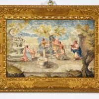 The first painting on the left shows a scene set in an elegant garden, with a carved Baroque-style fountain, leafy trees and architecture in the background. In the center, a group of women dressed in classical tunics is gathered around a female figure sitting near a large tub: this is Bathsheba, surrounded by her handmaids. The delicate colors—especially blues, pinks and ochres—create a luminous and serene atmosphere. The scene refers to the famous episode narrated in the Second Book of Samuel: King David, looking from the terrace of his palace, sees Bathsheba washing and is fascinated by her. From this encounter will be born a forbidden relationship and a series of dramatic events that will mark the history of Israel. The painting, however, chooses to represent the moment of the bath as a harmonious and intimate scene, focusing on the beauty and tranquility before the events that will follow.