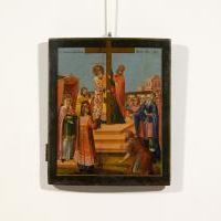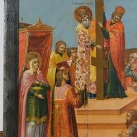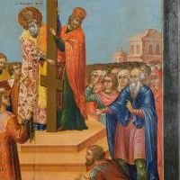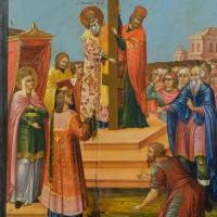 Sie stellt das zweite der großen Feste des liturgischen Jahres dar (14. September), nämlich die Erhöhung des Kreuzes, die in der Auffindung des Kreuzes Christi durch Helena, die Mutter Konstantins, in Jerusalem und seiner Ausstellung vor den Gläubigen durch den Patriarchen Makarios im Jahr 326 besteht. Die Ikone stammt daher von einer Ikonostase, in der sie wahrscheinlich in der Festordnung platziert war.