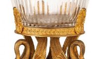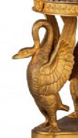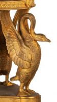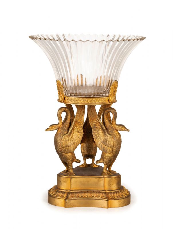 Tischaufsatz aus vergoldeter Bronze und bearbeitetem Glas, Frankreich, 19. Jahrhundert, Empire-Stil Maße: cm H 31,5 x Durchmesser cm 22 Preis: vertrauliche Verhandlung Dem Objekt liegt ein Echtheitszertifikat bei. Der raffinierte Tischaufsatz wurde in der zweiten Hälfte des 19. Jahrhunderts in Frankreich aus fein ziseliertem und vergoldetem Bronze mit einer Schale aus bearbeitetem Glas mit Verjüngungen gefertigt. Die Kombination von Glas und Bronze wirkt immer sehr elegant und leuchtend. Im Empire-Stil hat er eine Struktur in Form eines Stativs mit Schwänen mit ausgebreiteten Flügeln, die auf einem dreiteiligen und geformten Sockel mit in der Binde zu Palmettenmotiven ziselierter Bronze ruhen. Dieser Tischaufsatz ist sehr elegant, wunderschön in Kombination mit antiken Möbeln, aber auch in modernen Umgebungen, auf einem Tisch, einer Konsole, einem Guéridon oder einer Kommode platziert. Er kann auch als Blumenhalter gedacht werden, der äußerst dekorativ und von großer szenischer Wirkung ist.