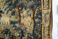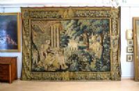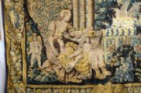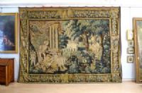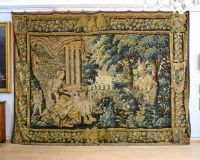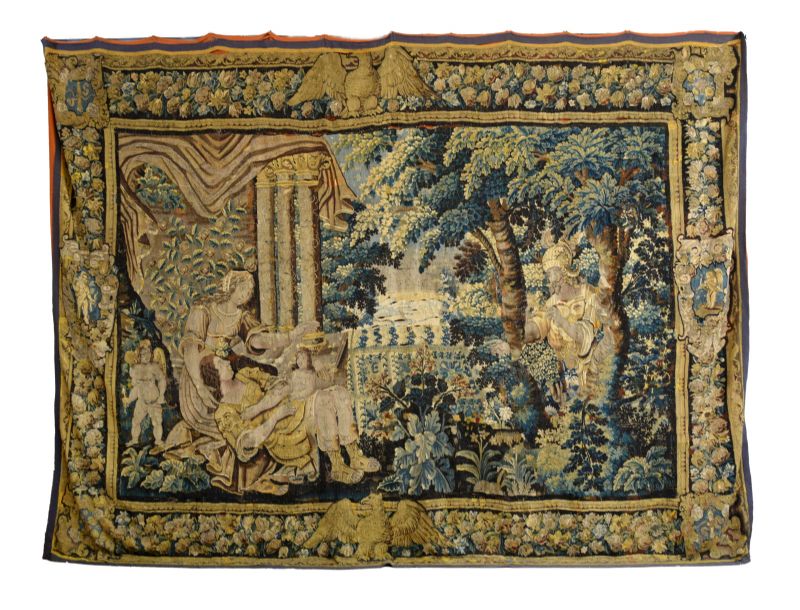 Wandteppich aus Wolle aus dem 16. Jh., Flandern Brüssel Maße: ca. H 310 x B 405 cm Preis auf Anfrage Objekt mit Echtheitszertifikat Der wunderschöne und wertvolle Wandteppich, von feiner Verarbeitung und aus Wollgarnen gefertigt, wurde im 16. Jahrhundert in Flandern hergestellt. Stilistisch weist er Ähnlichkeiten mit den in der Manufaktur von Brüssel produzierten Werken auf, in denen vergleichbare chromatische Gleichgewichte und Bordüren mit Blumen und Früchten zu finden sind. Innerhalb einer reichhaltigen Bordüre mit Blumen und Früchten, unterbrochen von Amoretten und Adlern, ist eine Szene aus der antiken Mythologie dargestellt. Der Wandteppich, eine textile Kunstform, hat eine sehr lange Tradition und erlebte gerade in Flandern zwischen dem 13. und 15. Jahrhundert den Höhepunkt seiner Entwicklung und künstlerischen Qualität. Flämische Wandteppiche sind prestigeträchtige Kunstwerke, Meisterwerke der Eleganz, die von adeligen Auftraggebern für ihre Paläste in Auftrag gegeben wurden. Seit dem Beginn des 15. Jahrhunderts ist Arras das wichtigste Produktionszentrum (daher der Ursprung des italienischen Namens: arazzo). Bereits in der zweiten Hälfte des 15. Jahrhunderts entstanden weitere bedeutende Manufakturen in Brügge, Oudenaarde, Antwerpen und Brüssel. Vom zweiten Hälfte des 15. Jh. bis zum 17. Jh. war Brüssel die Hauptstadt der europäischen Tapisserie. Der Erfolg des dekorativen Wandteppichs erklärt sich zum Teil durch seine leichte Transportierbarkeit: Könige und Adlige konnten sie zusammenrollen und von einer Residenz zur anderen transportieren und sie wurden im Winter zur Isolierung an die Wände der Schlösser gehängt, sowie zur dekorativen Ausstellung. Die Ikonographie der meisten Wandteppiche geht auf schriftliche Quellen wie die Bibel und die Metamorphosen des Ovid zurück; religiöse und mythologische Bilder sind daher das Thema vieler in dieser Zeit hergestellter Wandteppiche.