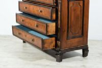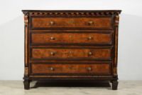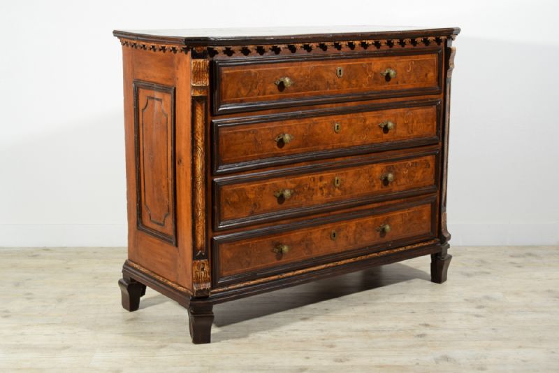 Questo cassettone è stato realizzato in Lombardia in epoca barocca alla fine del XVII secolo. La struttura lignea è in noce massello, lastronato ed intarsiato con radica di noce e legni dolci sul fronte dei quattro cassetti. Il piano del mobile e la base sono leggermente aggettanti, supportati da montanti anteriori a 45 gradi, intagliati e modanati a simulazione di due lesene, laccati e decorati da incisioni a foggia vegetale. Al di sotto della cornice del piano, sul lato anteriore e sui laterali, percorre il perimetro una fascia detta a lambrecchini, ovvero una fitta sequenza di elementi trilobati, caratteristica dell’area lombarda. I fianchi sono decorati con intagli e cornici geometriche di colore più scuro. I piedi, anch’essi scuri, sono a mensola ed aggettanti. Lo stato di conservazione è buono; si segnalano alcune mancanze e piccoli difetti.