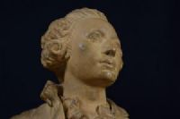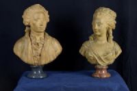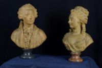 Pair of terracotta busts resting on circular marble bases, France, 19th century. Measurements of the male figure: H 63 x W 43 x D 24 cm; female figure: H 60 x W 37 x D 19 cm. Private negotiation. Item accompanied by a certificate of authenticity. The refined pair of busts depicts a man and a woman dressed according to the fashion of mid-18th century France. The graceful young woman has her hair styled according to the taste that spread at the court of King Louis XV. She wears a simple dress that rests on her neckline. The man wears his hair tied in a ponytail with a ribbon. He wears an open jacket that showcases a rich Rococo-style shirt. The busts bear the signature "Augustin Pajou Paris" and are dated 1725 and 1745.