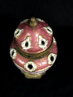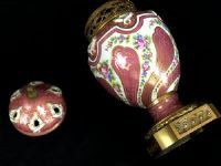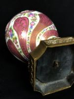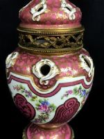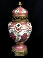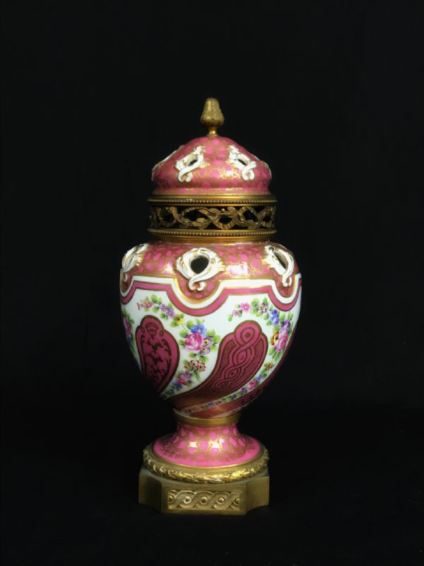 Raffinato bruciaprofumi a forma di potiche in porcellana policroma, dipinta con raffinati decori geometrici in oro su fondo rosso magenta chiaro e splendidi bouquet di fiori. La base e la fascia del coperchio traforata, con motivi fogliati e nastri ornamentali, sono in bronzo cesellato e dorato. Realizzato in Francia nel XIX secolo in stile Luigi XVI, riprende il gusto delle porcellane della celebre manifattura di Sèvres.