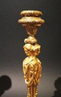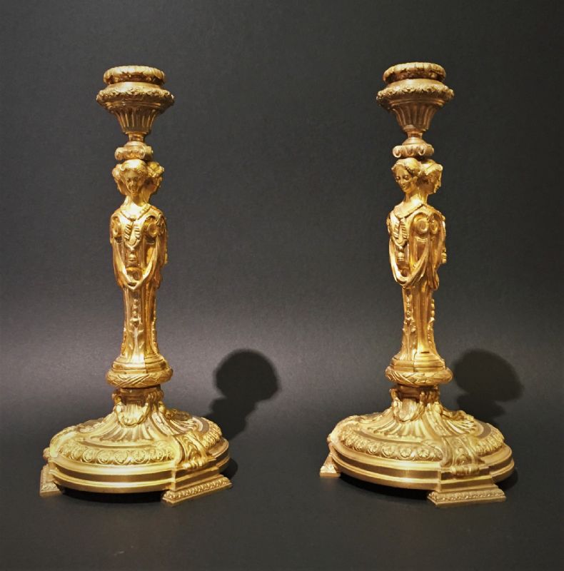 Questi due candelieri in bronzo cesellato e dorato sono stati realizzati all’inizio del XIX secolo e sono ispirati al gusto neoclassico che si sviluppò in Francia dopo il 1750 (epoca Luigi XVI) coinvolgendo tutte le arti decorative. Tre figure femminili, identificabili come vestali e poste di schiena tra loro, formano il fusto del candeliere. La base circolare a gradoni, con tre piedi, ha un raffinato cesello con elementi vegetali di gusto classico. Sopra la testa delle tre donne è posto un elemento a sezione circolare che regge la candela, decorato con elementi fitomorfi. Questo modello è ispirato ai lavori di Robert-Joseph Auguste (1723-1805) che, insieme a Jacques Roettiers (1707-1784) svilupparono il neoclassico nell’oreficeria. Questi candelieri sono confrontabili con una coppia di candelieri realizzati nel 1775 da Auguste per re Gustavo III di Svezia, e oggi conservati al Metropolitan Museum di New York.