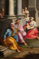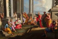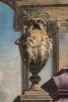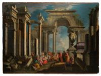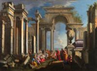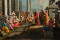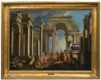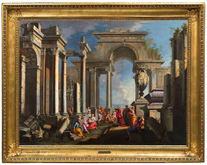 L’opera, dipinta con gran finezza anche nei dettagli e nelle piccole figurine, è certamente attribuibile all’importante pittore romano Alberto Carlieri (Roma, 1672 - 1720) in quanto si possono riscontrare motivi stilistici comuni dei suoi lavori. Elementi caratteristici sono le suggestive disposizioni compositive e la notevole maestria nella regia delle luci, così come la ricchezza dell’architettura e il raffinato, nonché minuzioso, descrittivismo dei particolari. Peculiare dell’autore è anche l’atteggiamento vivace delle figure, risolte con scioltezza nell’uso del colore, e inserite armoniosamente nelle architetture. Carlieri nasce a Roma nel 1672 e si avvia allo studio della pittura di architetture sotto la guida di Giuseppe de Marchis. Diviene allievo e poi collaboratore di Andrea Pozzo. Presente nelle più illustri quadrerie romane, dalla collezione di Filippo II Colonna, dei Rospigliosi e del cardinal Valenti Gonzaga, Carlieri elabora modelli compositivi ben riconoscibili, influenzati, oltre che dalla pittura del maestro anche quella di Viviano e Nicolò Codazzi. La sua attività pittorica è seguibile tramite le opere firmate, attorno alle quali è stato possibile costruire un catalogo non piccolo di tele. Le notizie sul Carlieri e le sue opere firmate o datate si scalano fra 1690 e 1720 circa. Nulla di preciso si conosce della vita del pittore, che dovrebbe essere morto a Roma poco dopo il 1720. Tra gli studi sul Carlieri risulta significativo quanto indagato da Marshall, e in seguito ribadito da Giancarlo Sestieri, circa l’influenza che Giovanni Ghisolfi (Milano 1623-1683) e Giovanni Paolo Panini (Piacenza 1691 – Roma 1765) ebbero sulle architetture del nostro pittore. Vi sono alcune perplessità attributive per certe opere, storicamente date al Panini o al Ghisolfi, che potrebbero invece essere restituite al Carlieri o viceversa. Al centro di una diatriba attributiva vi è il Capriccio con la predica di un apostolo conservato come Panini autografo al Museo Cristiano di Esztergom in Ungheria ma che fu anche attribuito a Ghisolfi o allo stesso Carlieri, come propone Sestieri. Certamente il nostro pittore, soprattutto nelle tele sviluppate verticalmente, ripropone numerosi elementi tratti dal “Esztergom composizion”, come viene definito questo modulo compositivo in tutte le sue varianti. Si tratta di composizioni in cui le grandi architetture sono frammentarie; pittoresche verzure le ricoprono in parte; resti architettonici si trovano ammassati a terra; è sempre presente un dettaglio architettonico con la trabeazione del colonnato interrotta; la prospettiva ha una fuga laterale rispetto alla composizione; è sovente ambientata una scena raffigurante la predica di Cristo o di un santo. Carlieri sfrutta con assiduità questo schema compositivo. Possiamo in parte riscontrarlo anche nel dipinto in oggetto benchè sia sviluppato orizzontalmente. In questi dipinti, e in generale nei lavori di questo artista, si riscontrano sovente alcune figure o oggetti che l’autore ama inserire con alcune piccole varianti. Tra queste vi è il vaso di epoca classica in pietra con figure femminili a bassorilievo. Altrettanto il personaggio semidisteso che si sostiene con un braccio a terra. Questo particolare, molto frequente e raffigurato anche in modo speculare, può quasi considerarsi una firma del Carlieri. L’autore raffigura più volte la predica di un apostolo. Come sottolinea Sestieri, dovettero essere i soggetti a guidare le commissioni di Carlieri. Ad alcuni pertanto arrise a maggior successo, stando alle loro numerose versioni, come le «Parabole» o le «Prediche» di Cristo o di Apostoli. Nel presente studio (vedi expertise allegato) sono stati portati a confronto alcuni dei più significativi esempi.
