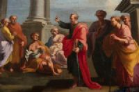 La scena descritta è La predica di san Paolo nell'Areopago di Atene. San Paolo è chiaramente riconoscibile per alcuni elementi che appartengono alla sua tradizionale iconografia: raffigurato canuto e calvo, con una barba lunga e di forma allungata, veste una tunica color verde con mantello rosso e impugna, qui con la mano sinistra, una spada con la punta rivolta verso terra. La spada, simbolo della potenza, ha un doppio interpretativo: allude infatti sia alla decollazione, ovvero al martirio di san Paolo, che alla forza della fede e alla proclamazione della parola divina. Paolo infatti parlò ai gentili, cioè ai popoli di cultura greco-latina, considerati pagani dagli ebrei, de «la spada dello Spirito, cioè la parola di Dio» (Ef. 6,17). La spada è una parte dell’armatura spirituale che Paolo dice di indossare per permettere di combattere efficacemente contro il male. La scena raffigurata si ispira al momento in cui Paolo pronuncia un discorso ad Atene presso l'Areopago (in Atti degli Apostoli 17:16–34). Si tratta di uno dei momenti più drammatici e più dettagliatamente riferiti della carriera missionaria di san Paolo. L’Apostolo aveva incontrato delle opposizioni nella sua predicazione a Tessalonica ed a Berea nel nord della Grecia e, tra la fine del 49 e l'inizio del 50, si reca ad Atene per essere al sicuro. Afflitto nel vedere Atene piena di idoli, Paolo si reca all'Areopago, l'alto tribunale di Atene, per spiegare ciò che sosteneva. "Areopago" significa letteralmente "Rocca di Ares"; era un luogo dove si trovavano templi, strutture culturali ed era l'alto tribunale della città. Il discorso di Paolo si fonda su cinque punti principali: l'ignoranza del culto pagano; l'oggetto di culto è l'unico Dio Creatore; il rapporto di Dio con l'umanità; idoli d'oro, d'argento e di pietra come oggetti di falso culto; e in conclusione, è tempo di porre fine all'ignoranza. Questo discorso è uno dei primi tentativi di spiegare la natura di Cristo ed è un primo passo nel cammino che porta allo sviluppo della Cristologia.