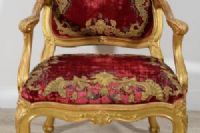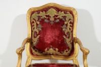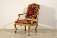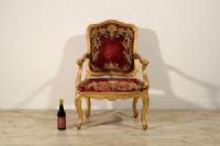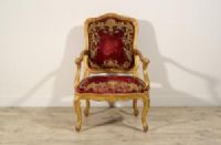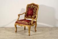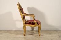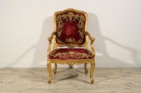Geschnitzter und vergoldeter Holzarmstuhl, Genua, Ludwig XV. Epoche, Mitte des 18. Jahrhunderts. Maße: H 108 x B 73 x T 77 cm, Sitzhöhe 46 x Sitztiefe 51 x Sitzbreite 61 cm Preis: Verhandlungssache Dem Objekt liegt ein Echtheitszertifikat bei. Der prachtvolle, fein geschnitzte und vergoldete Holzarmstuhl von beträchtlicher Größe wurde in Genua in der Ludwig XV. Epoche, Mitte des 18. Jahrhunderts, gefertigt. Die fünfeckige Rückenlehne hat ein bewegtes und kurvilineares Profil und ist mit Schnitzereien mit pflanzlichen Elementen und Rocailles verziert. Die leicht bewegten und mit geschnitzten Blättern verzierten Armlehnen enden mit einer Volute und gehen von dort in den Sitz über. Die Zarge unter dem Sitz ist bewegt und mit Rocaille-Elementen verziert, ebenso wie die geschwungenen Beine und die Volutenfüße. Auf der Rückseite wurde eine Neulackierung in Ockergelb vorgenommen. Rückenlehne und Sitz sind gepolstert und mit rotem Samt mit edlen ockerfarbenen und grauen Dekoren bezogen. Die Art der Schnitzerei verleiht dem Sessel Raffinesse und Anmut. Die geformte Rückenlehne, die bewegten Armlehnen und die geschwungenen Beine verleihen diesem Sitzmöbel Eleganz und Charme, das sich leicht in jeden Einrichtungsstil einfügen lässt, sei er nun modern oder antik.