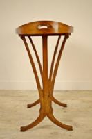 Il piano di appoggio, di forma ovale, con bordatura alta e prese laterali, si presenta quale vassoio per offrire bottiglie e bicchieri, ma anche per un vaso o quant’altro si gradisca.