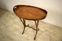 Questo raffinato tavolino è opera dell’ebanista e ceramista francese Emile Gallè (1846-1904). Realizzato nei primi anni del Novecento, è in legno con il piano intarsiato in essenze lignee diverse. Grazie all’uso sapiente delle diverse colorazioni dei legni è descritta una natura morta con composizione di fiori e una farfalla. Sul piano inoltre l’ebanista si firma “Gallè”.