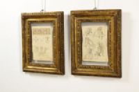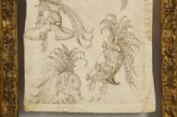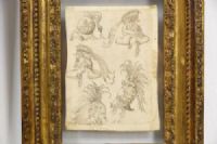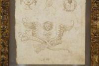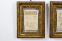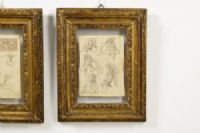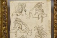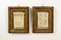 Paar Tuschzeichnungen auf Papier mit Studien zu Grotesken, Friesen und Helmen. Maler aus Mittelitalien aus dem 17. Jahrhundert, signiert mit dem Monogramm "A.M.". Maße: cm B 45,5 x H 59,5 x 5,5; Blatt cm 22 x 33 / cm B 46,5 x H 59 x 5,5; Blatt cm 22,5 x 31,5 Preis: Euro 6.500,00 - 7.500,00 Den Objekten liegt ein Echtheitszertifikat bei. Das Paar Blätter befindet sich in gutem Zustand und ist von antiken, geschnitzten und vergoldeten Holzrahmen umgeben. Sie zeigen verschiedene Studien in Tusche mit unterschiedlichen Motiven. Im Einzelnen stellt das erste Werk oben die Studie für einen Fries im Renaissancestil dar, unter dem sich einige Studien befinden, die sich wahrscheinlich auf ein Familienwappen beziehen. Unten in der Mitte befindet sich ein Monogramm "A.M.". Das Blatt ist auch auf der Rückseite bearbeitet, wo einige detaillierte Dekorelemente im Stil der Renaissance-Grotesken gezeichnet sind, in denen unter den verschiedenen Motiven auch eine Sphinx, eine weibliche Figur mit Helm, mythologische und Fantasietiere erscheinen. Auch hier befindet sich unten das Monogramm "A.M.". Das andere Werk zeigt verschiedene Studien für Helme. Diese sind reich an Details wie Federn, Dekorationen mit mythologischen Tieren wie Greifen, Sphinxen und einem Faunen sowie dem Kampf zweier Krieger aus der Antike. Unten in der Mitte befindet sich ein Monogramm "A.M.".