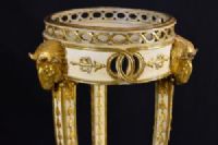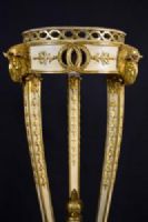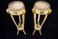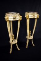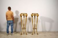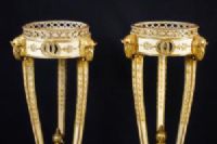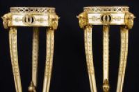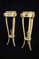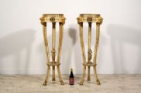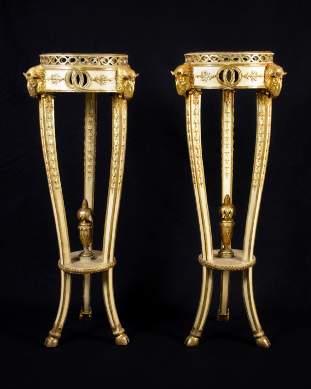 Paire d'importants guéridons néoclassiques en bois laqué et doré Mesures : h 126 x diamètre max 44 cm ; diamètre au plateau 33 cm Prix : négociation réservée Objet accompagné d'un certificat d'authenticité Cette précieuse paire de guéridons a été réalisée en Italie vers la fin du XVIIIe siècle, à l'époque néoclassique. Les deux élégants et gracieux tripodes, hauts et étroits, ont une structure en bois sculpté, laqué et doré. Le plateau, décoré en faux marbre, est rond et circonscrit par un cadre ajouré avec des motifs géométriques. La bande inférieure présente une sculpture ajourée à certains endroits, des décorations phytomorphes en relief et trois sculptures en haut-relief en forme de tête de chèvre, caractéristiques de l'époque. Au voisinage des têtes partent trois pieds sinueux et légèrement courbés qui se terminent par un sabot de chèvre. Au point le plus convexe des pieds se trouve un raccord circulaire sur lequel repose un élément en bois sculpté en forme de vase classique et un élément sommital avec des motifs feuillagés. Les guéridons, très décoratifs et lumineux, sont parfaits dans tous les intérieurs, de l'entrée au salon, en passant par le bureau ou la chambre à coucher. On peut y placer des lampes, des sculptures, des bronzes ou encore des vases avec des plantes et des fleurs. Ils sont magnifiques côte à côte, séparés par un autre meuble, ou même exposés individuellement, près d'un angle ou au centre d'une pièce.