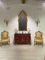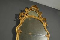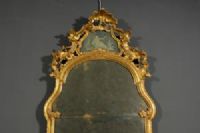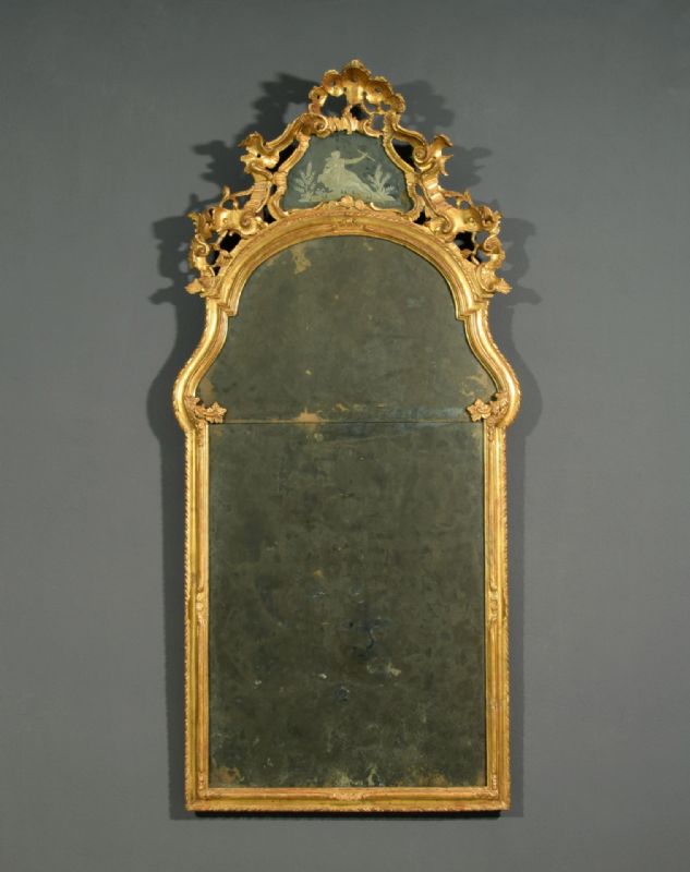 Spiegel aus geschnitztem und vergoldetem Holz, Venedig, 18. Jahrhundert Maße: cm H 171 x B 81 x T 15 Preis: Verhandlungssache Objekt mit Echtheitszertifikat Dieser elegante Spiegel wurde im 18. Jahrhundert in Venedig gefertigt und weist das charakteristische Dekor des venezianischen Rokoko auf. Der Spiegel aus geschnitztem und vergoldetem Holz hat eine längliche Form mit einem geschwungenen oberen Abschluss und einem wichtigen durchbrochenen Giebel mit geschnitzten Dekorationen mit phytomorphen Motiven mit Voluten und Locken. In der Mitte befindet sich eine Radierung auf Glas, die eine mythologische Figur darstellt, vermutlich die verlassene Dido. Quecksilberspiegel. Dieser Spiegel ist sehr elegant und hat eine große dekorative Wirkung. Er kann problemlos in verschiedenen Umgebungen platziert werden, wie z. B. in Salons, Arbeitszimmern, Fluren und Eingängen oder Schlafzimmern. Auch in Kombination mit modernen Möbeln sehr schön, hat er eine wichtige szenische Präsenz. Er kann über einer Konsole, einem Kamin oder einem Sideboard platziert, aber auch auf dem Boden stehend oder als einziges Dekorationselement aufgehängt werden.