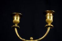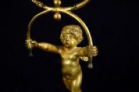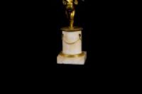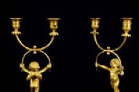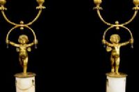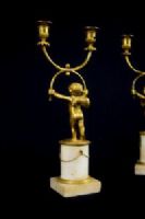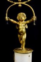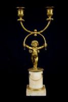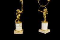 Par de castiçais de duas luzes em bronze cinzelado e dourado, base em mármore, Época Luís XVI, França. Medidas: altura total 35 cm; base A 10,5 cm x 8,2 x 8,2; putti L 15 x P 10 cm Preço: entre 2.500,00 e 3.500,00 Euros O esplêndido par de castiçais foi realizado na França no século XVIII em bronze finamente cinzelado e dourado na época Luís XVI. São compostos por putti alados ou amorins em bronze cinzelado e dourado que sustentam uma forma particular de dois braços de castiçal, como se os mantivessem em equilíbrio. Os putti repousam sobre uma base cilíndrica em mármore branco com aplicações de pequenas correntes em bronze dourado, pé quadrangular. Objeto acompanhado de certificado de autenticidade