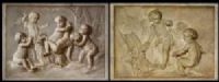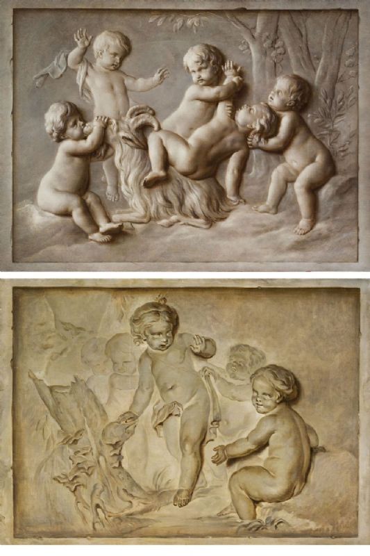 La coppia di dipinti, ad olio su tela, raffigura dei trompe l’oeil con giochi di putti. Si tratta di pitture a grisaille, ovvero monocromatiche, che simulano bassorilievi in marmo con figure di putti intenti a giocare con una capra in ambienti all’aperto.
