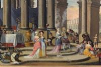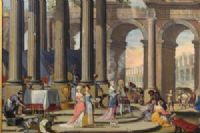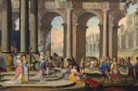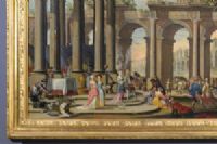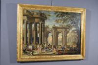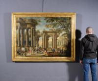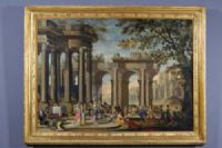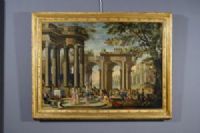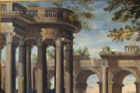 Architectural Capriccio with figures, Isaac De Moucheron (Amsterdam 1667/70-1744) Oil on canvas. Dimensions: with frame H 134 x W 175 cm Price: confidential negotiation Object accompanied by a certificate of authenticity The painting is a significant example of an architectural capriccio (i.e., imaginative and fantasy architectures or parts thereof) set in the Roman surroundings, where sumptuous architectures (with arches, columns, capitals, and balustrades) of classical inspiration, modified by Baroque elements, stand out in the foreground, and in turn are surrounded by an imposing ancient aqueduct in partial ruin which, gradually fading into the background, gives the painting an ensemble of effective depth. In detail, the composition represents a large space, in front of and bordered by the imposing structures, where some aristocratic figures engage in pleasant conversation in a serene and relaxed context of normal daily life (see the two noblewomen with a poodle). There are subjects of more humble social extraction, engaged in material occupations. A large drape is suspended between the columns, almost creating a more private space for the refreshment of noble visitors. The architectures are outlined with skill and undoubted knowledge of perspective; the light that radiates between the arches and columns determines effective chiaroscuro effects. The chromatic palette favors light tones with dense but at the same time fluid and delicate brushstrokes on a surface made uniform by a careful preparation of the background. The figures are rendered naturally, refined even in the details, such as the delicate texture of the lace and trimmings of the noblewomen. The work is attributed to Isaac De Moucheron (Amsterdam 1667/70-1744), a painter, engraver, and architect, Dutch by birth but from a family of French origin. The artist specialized in views and landscapes often characterized by complex classical and Baroque architectures, created on the models drawn during his youthful stay in Rome and set in a naturalistic context with an Arcadian tendency characterized by intense luminosity and refined colorism on the example of his contemporary and compatriot Gaspar Van Wittel and the Frenchman Gaspar Dughet. The stylistic comparison with other signed paintings by the author allows us to refer the painting to De Moucheron, placing the painting in the author's period of maturity, when the artist develops a specific originality in the mannerist character of the landscape, typical of the dominant romantic naturalism. The work is accompanied by an authenticity certificate from Cesare Lampronti.