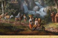 Il pregevole dipinto, attribuibile al pittore Giovanni Battista Innocenzo Colomba (1713 – 1793), raffigura un paesaggio boscoso animato da personaggi. A centro della tela si osserva un ponte a due fornici dal quale sgorgano vivaci cascate, caratteristiche delle opere del pittore. Oltre al ponte, costruito in mattoni e percorso da alcuni viandanti con destrieri, il paesaggio si apre, collinare, per poi essere delimitato da grandi montagne che schiariscono lontane. Una rocca mostra un castello turrito che domina sul vuoto. In primo piano, lungo un sentiero, diverse persone sono colte e ritratte nella loro quotidianità. Da sinistra, una coppia di viaggiatori si concede una sosta, mentre poco dietro altri, accompagnati dai cavalli, proseguono il loro percorso. Al centro due contadini, lei con un cesto di vimini sul capo ricolmo di grano e una falce in mano, lui seduto, con bastone e gerla sulle spalle, si intrattengono in un dialogo, mentre sulla destra due umili genitori pregano al cospetto di un bimbo che abbisogna di cure. Alla drammatica scena, ricca di pathos, esaltata dai gesti di conforto e preoccupazione di due persone che accorrono, si uniscono una coppia di frati attraverso un gesto di benedizione, ricordano la potenza della fede e della speranza. Si tratta dunque di un’opera di bella fattura, molto gradevole sul piano estetico e certamente decorativa. Tuttavia il paesaggio e i molti personaggi descritti celano un più ricco e vigoroso messaggio di fede che l’autore sviluppa con discrezione e forza descrittiva. Nell’opera è immediatamente riconoscibile lo stile che contraddistingue le opere del pittore maturo, in cui la tavolozza vivace e luminosa è accompagnata da fini pennellate a formare paesaggi che oscillano tra il Rococò e il Neoclassicismo.