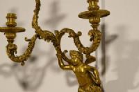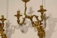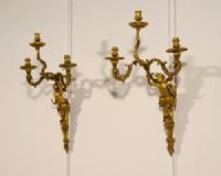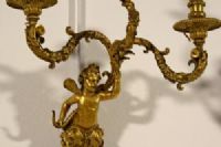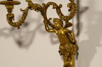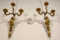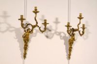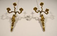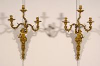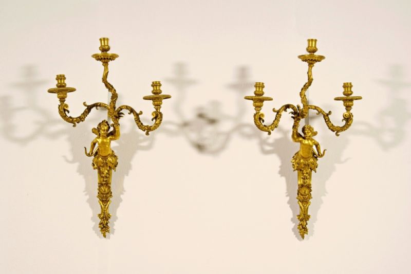 La raffinata coppia di appliques è stata realizzata in Francia nel XIX secolo in bronzo cesellato e dorato. La qualità e il disegno, particolarmente raro e inusuale, si ispira agli stili Luigi XIV e Luigi XV. Il corpo centrale di ogni applique ha un ornato con motivi fitomorfi dal quale diparte in aggetto un elemento composto da ricche foglie d’acanto. Da questo si inserisce la figura di un putto alato a mezzo busto che sorregge tre bracci reggicandela. Ogni braccio è decorato con elementi fogliati. Particolare è la presenta di bobeches diverse che movimentano la struttura compositiva: le due laterali hanno un ornato con disegni geometrici, mentre quello centrale ha una riserva con motivi a piccole sfere. Le due applique, speculari tra loro, si contraddistinguono per un cesello di alta qualità e un’elegante presenza scenica e decorativa. Sono adatte accanto ad arredi antichi e moderni e grazie alla lucentezza della doratura apporteranno una raffinata presenza presso qualunque ambiente si vogliano inserire.