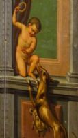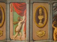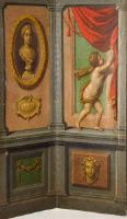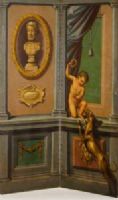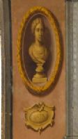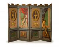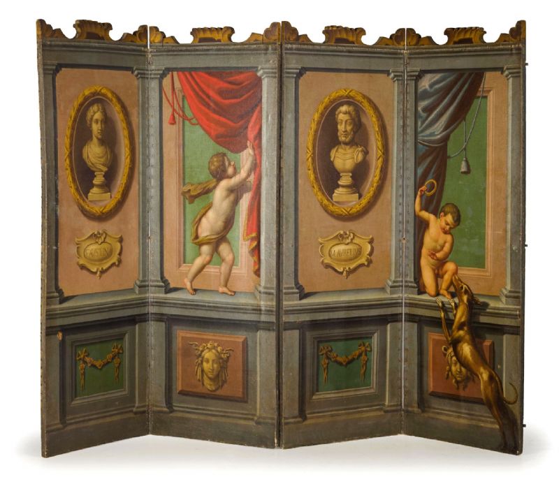 Gran biombo neoclásico de cuatro paneles pintados al óleo sobre lienzo, Italia, segunda mitad del siglo XVIII Medidas: Cm H 208,5 x L 300 En buen estado de conservación Trato reservado Objeto acompañado de certificado de autenticidad El gran biombo está compuesto por cuatro paneles en lienzo pintado al óleo. De gusto neoclásico, se remonta a la segunda mitad del siglo XVIII. Cada panel representa un trampantojo, es decir, una falsa arquitectura de gusto clásico con columnas de mármol de sección cuadrada y amplia zocadura. Dentro de los espejos rosados del primer y tercer panel están pintados, como insertados en una hornacina con marco de bronce, bustos antiguos de mármol: se trata, como se puede leer en las cartelas de falso mármol de abajo, de los bustos del emperador Marco Aurelio y de su esposa Annia Galeria Faustina. En el registro inferior, en espejos verdes, están representadas guirnaldas de cintas, lazos y flores. En los otros paneles, el pintor juega con la falsa arquitectura pintando dos grandes marcos de mármol rosado, parcialmente cubiertos por dos grandes, suaves y voluminosas cortinas drapeadas, una roja y la otra en tonos de azul. En el grosor de la zocadura están representados dos putti: el primero intenta mover la cortina roja, mientras que el otro juega con un lebrel que desde el suelo intenta alcanzarlo. En la porción inferior están representadas dos cabezas femeninas en grisalla, que simulan esculturas marmóreas. Iconográficamente hay que reconocer a la diosa Ceres o Deméter, divinidad materna de la tierra y de la fertilidad, numen tutelar de las cosechas y del nacimiento. El marco del bastidor superior está modelado con líneas suaves y sinuosas que aligeran la estructura arquitectónica e incrementan su decoración. Este biombo, de majestuosas dimensiones y de preciosa calidad pictórica, se presta a ser insertado, en cualquier ambiente de su casa, ya sea junto a muebles antiguos como modernos. Se presta bien también expuesto colocado en la pared, como uno o cuatro distintos cuadros. De gran impacto escénico y decorativo gracias al trampantojo, resulta además extremadamente agradable a través de la dinamicidad y vivacidad de la escena representada. Están en curso estudios histórico-artísticos con el fin de delinear mejor la figura del pintor y el contexto cultural en el que la obra ha sido realizada. Serán brevemente insertadas nuevas imágenes.