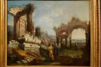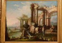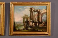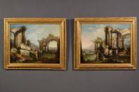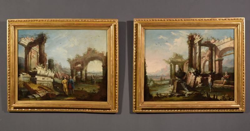 I due pregevoli dipinti, realizzati ad olio su tela, raffigurano paesaggi con capricci architettonici animati da alcune figure. Il capriccio architettonico, genere artistico che si fa strada nella pittura italiana a partire dal XVII secolo, è caratterizzato dalla raffigurazione di architetture fantastiche o invenzioni di tipo prospettico, talvolta combinate con elementi tratti liberamente dalla realtà. Nelle opere osserviamo grandi fornici, colonnati e fregi caduti in rovina, posti in prospettiva in modo da creare una profondità maggiore, sono abitati da vegetazione spontanea che ne ricopre in parte la sommità. Attorno altri elementi architettonici di gusto classico, quali sarcofagi e vasi, smuovono ed equilibrano la composizione. Verzure tingono il terreno, che sfuma all’orizzonte in pianure con alcuni piccoli e distanti edifici, mentre alcune montagne rocciose si perdono lontane, creando una scenografica quinta che sottolinea e amplifica l’effetto della linea di fuga prospettica degli edifici. Alcune figure di gentiluomini che si intrattengono in discorsi, accompagnati da un cane, altri viandanti e personaggi tratti dalla vita rurale animano la composizione.