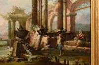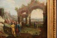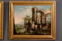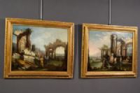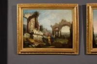 Coppia di dipinti raffiguranti Paesaggi con rovine e personaggi