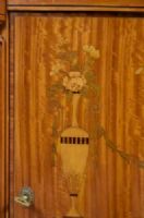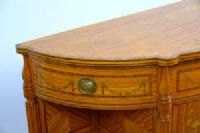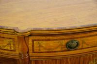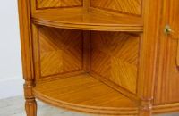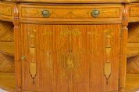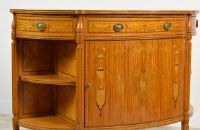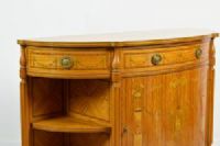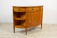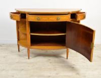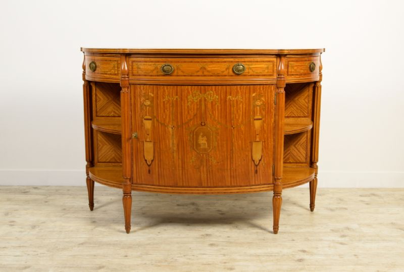 Credenza desserte em meia-lua em madeira de cetim ou satinwood. Estilo Sheraton, Inglaterra, último quartel do século XIX Medidas A 102 x L 146 x P 51 cm Preço sob consulta A requintada peça de mobiliário buffet Desserte à Demi-lune remonta ao último quartel do século XIX e foi fabricada na Inglaterra em madeira de cetim ou satinwood. A madeira de cetim se distingue por uma coloração clara, caracterizada por um brilho semelhante à seda e uma fina listra com áreas claras alternadas com áreas escuras. O marceneiro autor deste móvel combinou habilmente os espelhamentos de madeira para criar efeitos decorativos brincando com os veios. O estilo retoma o desenho dos móveis de Thomas Sheraton, célebre marceneiro londrino, que marcou, entre 1792 e 1805, um momento importante na história do móvel inglês. Sheraton difundiu o estilo que leva seu nome e que se diferencia pela leveza do desenho, formas lineares, simples mas de refinada elegância, sublinhada pela delicadeza dos elementos ornamentais, confiados às técnicas da talha e da marchetaria e pelo uso de madeiras preciosas. Esta credenza em demi-lune é suspensa sobre quatro pés torneados, correspondentes a pilastras que percorrem a altura do móvel. Possui três gavetas, uma grande central, decoradas com tarjas representando guirlandas e laços. As alças de bronze apresentam uma placa com vaso neoclássico. Centralmente possui uma porta com o painel decorado com requintadas tarjas com vasos de flores, fitas, elementos neoclássicos e um medalhão octogonal com figura clássica em grisaille. No interior existem dois amplos compartimentos, assim como nas partes laterais existem duas pequenas prateleiras também folheadas em madeira de cetim. Os móveis buffet são muito versáteis: adaptam-se a qualquer ambiente da casa, da entrada à sala de estar, e oferecem infinitas possibilidades de utilização.