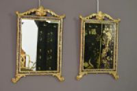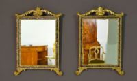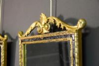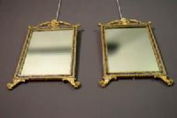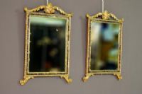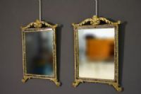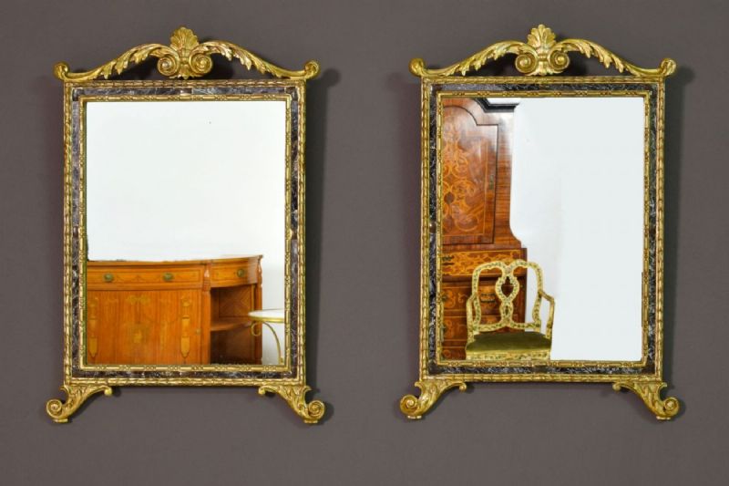 Par de espelhos neoclássicos em madeira esculpida e dourada, Sicília, final do século XVIII Medidas A 70 x L máxima 50 x L 43,5 moldura x P 3 Preço: negociação privada Objetos acompanhados de certificado de autenticidade. O par de espelhos encantadores foi feito na Sicília na era neoclássica, no final do século XVIII. Eles são compostos por uma moldura de caixa, esculpida em madeira, dividida em três seções. A parte mais externa tem uma escultura com motivos de folhas, enquanto a mais interna apresenta uma decoração geométrica. A seção central é composta por inserções de vidro pintado por dentro, simulando mármore. A moldura é suportada inferiormente por dois pés em volutas vegetais, enquanto a cimasa apresenta um elemento central, de gosto tipicamente neoclássico, composto por motivos de folhas em leque do qual partem simetricamente duas volutas foliares. A moldura de madeira deste elegante espelho tem um douramento em folha de prata meca. A mecagem é um tipo de douramento realizado sobre folha de prata para que esta assuma a aparência e a preciosidade da folha de ouro. A meca é uma tinta com uma receita antiga que era guardada zelosamente nas oficinas. Ela envolve o uso de goma sandraca e goma-guta em álcool, sangue de dragão e outros ingredientes que, misturados, contribuem para os diversos elementos cromáticos da meca. O par de espelhos é caracterizado pela elegância do estilo neoclássico, com um gosto compositivo particularmente adequado tanto em ambientes com móveis antigos quanto modernos. Seu tamanho contido permite que sejam facilmente inseridos em sua sala de estar, entrada ou escritório, onde retornarão muita luz refletida tanto pelo espelho quanto pela preciosidade do acabamento da madeira. Em bom estado de conservação.