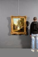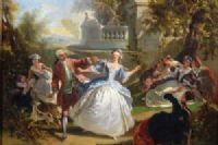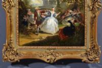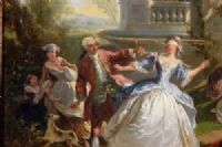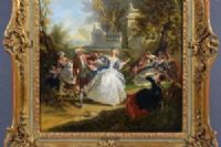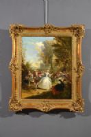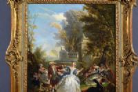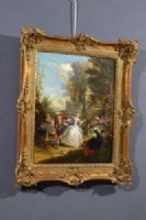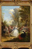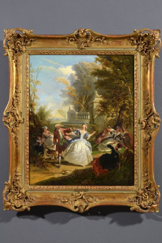 Nicolas Edward Gabe (París, 1814-1865), Gallina ciega Óleo sobre tela, cm h 72 x l 58 (sin marco); con marco cm h 98 x l 84 x p 8 Precio: negociación reservada Objeto acompañado de certificado de autenticidad y peritaje (descargable al final de la página) El cuadro, realizado al óleo sobre tela, representa a algunos nobles con trajes del siglo XVIII jugando a la gallina ciega en el jardín de un palacio aristocrático. La obra está firmada abajo a la derecha como “EGabe”, como solía dejar su nombre el pintor francés Nicolas Edward Gabe (París, 1814-1865). Se trata de un cuadro del siglo XIX claramente inspirado en los modelos franceses Rococó del siglo XVIII, tanto por la elección estilística como, como veremos, por el tema. Nicolas Edward Gabe vivió y trabajó en París y en Francia y se especializó en la pintura de retratos, figuras, escenas históricas y paisajes. Utilizó diversas técnicas, desde el más tradicional óleo sobre tela, hasta el óleo sobre tabla y sobre cobre o la acuarela sobre papel, como demuestran diversas obras que nos han llegado hoy. Son casi inexistentes los estudios sobre su vida y su fortuna profesional. Sin embargo, el hallazgo de diversas obras suyas, firmadas y a menudo fechadas, permiten hoy delinear su figura artística. Diversas obras suyas expresan plenamente el gusto y la sensibilidad que se desarrolló en la primera mitad del siglo XIX en Francia. Gabe fue, de hecho, exponente de aquel Romanticismo histórico que vio representadas las diversas luchas políticas, sociales e industriales que marcaron el siglo, o episodios históricos de crónica militar, pero también retratos y escenas de género. Influenciado por los continuos desórdenes bajo Napoleón III y por la restauración de la monarquía, Gabe desarrolló, como muchos otros artistas coetáneos, un énfasis en la emoción y la glorificación del pasado más romántico, hacia la recuperación de modelos dieciochescos Rococó. Este estilo tendía a reproducir el sentimiento típico de la vida aristocrática, ociosa, libre de preocupaciones o el de la novela ligera. En la pintura gustó mucho la escena galante, variante aristocrática de la escena de género, representante de mujeres ocupadas en el tocador, en boudoirs o en ritos hedonistas que se hacen símbolo de una visión más astuta y mundana del arte. Los pintores usaron colores delicados y formas curvas para expresar el valor de la gracia y la ligereza. Entre los mayores exponentes, para la pintura, cabe recordar a Jean-Antoine Watteau, François Boucher, Jean-Marc Nattier y Jean-Baptiste Pater. Gabe se inspiró diversas veces en sus trabajos, proponiendo en sus lienzos temas y estilo típicamente rococó. El tema de la danza en el parque y sobre todo del juego de la gallina ciega fue a menudo representado en la pintura del siglo XVIII, ya que bien representaba el La gallina ciega es un juego de origen antiquísimo y se remonta a la época de la Antigua Roma, aunque las fuentes son siempre muy contrastantes. Representa una variante de otro famoso juego de exterior llamado el pillapilla, que se difundió en la Inglaterra victoriana. Fue muy practicado por la nobleza en la Francia del siglo XVIII. El juego representaba solo un viático de la relación amorosa, pretexto para favorecer las relaciones sentimentales entre los jóvenes de la época. La gallina ciega de los nobles del siglo XVIII podía desarrollarse incluso con solo dos jugadores, en el que uno era el vendado y el otro el competidor a capturar. La finalidad, por lo tanto, era solo la de crear un acercamiento entre una probable pareja de enamorados. Por otro lado, el mundo lúdico dieciochesco era astuto, lleno de trucos y engaños. Los nobles pasaban el tiempo en fútiles juegos como la gallina ciega, el ajedrez o la caza en los parques. De este modo, la nobleza del Antiguo Régimen, viviendo en la corte, era distraída y alejada de la vida política, cuyas decisiones eran prerrogativa de la monarquía absoluta. La comparación del lienzo de Gabe objeto de este estudio con algunas obras de Jean-Baptiste Pater (Valenciennes, 29 de diciembre de 1695 – París, 25 de julio de 1736) evidencia las fuentes de inspiración a las que miró el autor decimonónico. Carlotta Venegoni
