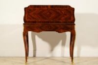 Questo elegante scrittoio a ribalta è stato realizzato in Francia verso la metà del XVIII secolo, in epoca Luigi XV. Il mobile è interamente lastronato nel pregiato legno di viola caratterizzato da una colorazione in cui il rosso scuro si alterna a striature violacee, consentendo all’ebanista di creare particolari giochi cromatici attraverso il posizionamento speculare delle specchiature secondo la venatura del legno.