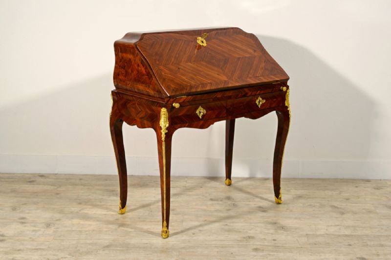 Lo scrittoio si compone di due parti, una inferiore e una superiore. La parte inferiore presenta due cassetti impreziositi da serrature con chiave e bocchette in bronzo cesellato e dorato. La parte superiore si compone invece di un vano apribile dotato di una piccola anta ribaltabile (chiamata appunto “ribalta”) che, ruotando su delle cerniere, può essere abbassata e rialzata in base alle necessità. Quando è aperta fornisce un comodo piano d'appoggio per scrivere, foderato in pelle, e rivela una serie di sei piccoli cassettini e quattro vani a giorno, in cui riporre il materiale da cancelleria e piccoli oggetti personali. È molto curata nei dettagli anche all’interno, interamente lastronato e con pomelli in bronzo dorato per l’apertura dei cassetti. Di particolare pregio, le barre di sostegno della ribalta, quando aperta, sono in ferro con pomelli terminali in bronzo dorato. La ribalta poggia su gambe leggiadre e sinuose di forma leggermente arcuata. Tutte e quattro le gambe sono arricchite da profili in bronzo dorato che originano con un decoro rocaille e terminano con i puntali dei piedi riccamente cesellati.