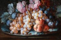Le due tele bella fattura raffigurano due nature morte composte da composizioni di frutta. I dipinti sono caratterizzati da una tavolozza cromatica basata su colori freddi, ferrosi, prevalentemente grigio-azzurri e violacei. Lo sfondo scuro e immerso nell’ombra funge da quinta, ponendo in risalto le composizioni. La frutta è sistemata all’aperto, nella tela di destra poggiata su un piano in pietra, nell’altra accomodata su un vassoio metallico insieme ad alcune rose e un garofano rosso che si intravede sullo sfondo.