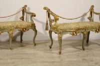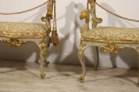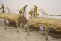 Coppia di panche barocche in legno intagliato, laccato e dorato, Roma, seconda metà del XVIII secolo
