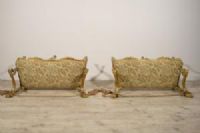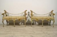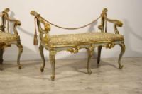 La loro struttura lignea è interamente scolpita, laccata e dorata a mecca. Si compone di una seduta con profilo mosso dalla quale dipartono due braccioli caratterizzati da elementi arcuati, mossi e culminanti in riccioli. L’effetto di grande movimento è esaltato dai decori di gusto rocaille con volute e foglie che le avvolgono creando dinamicità.