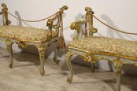 La coppia di panche, stabili e confortevoli, è molto decorativa e di grande arredo. Le panche sono presentabili affiancate o intervallate da consolle e cassettoni. Possono essere utilizzate in ingressi o corridoi, in saloni e studi, adatte ad essere accostate sia ad arredi antichi che moderni.