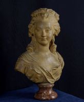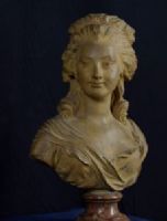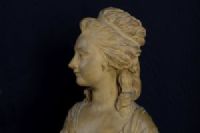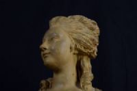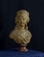 Terracotta bust depicting a noblewoman, marble base, France 19th century Measurements: cm H 60 x L 37 x D 19 cm Private negotiation Object accompanied by a certificate of authenticity The refined bust, made of terracotta, depicts a noblewoman dressed according to the fashion of the mid-18th century in France. The graceful young woman has her hair styled according to the taste that spread at the court of King Louis XV. She wears a simple dress that drapes across the neckline. The bust bears the signature of Augustin Pajou Paris and is dated 1765. The sculpture rests on a marble base with a circular section.